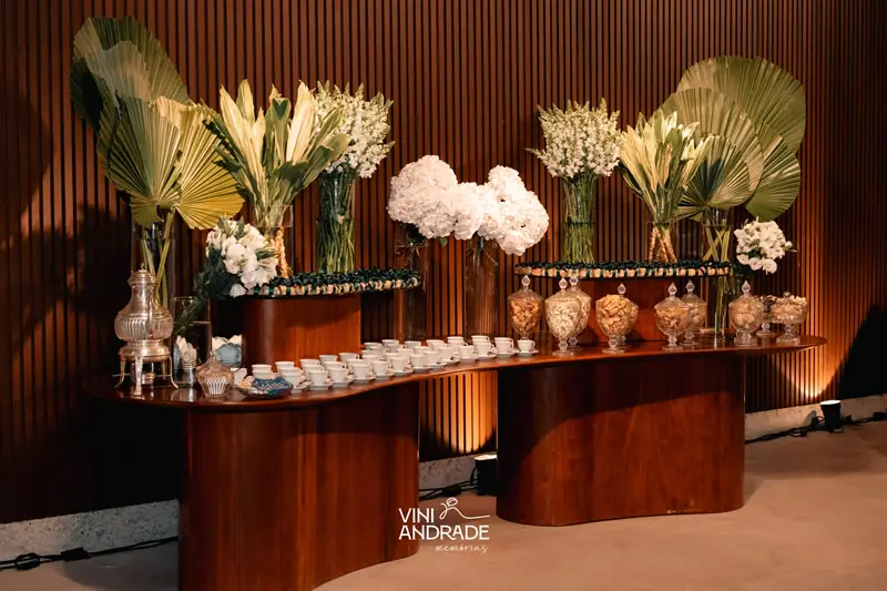 Um dos maiores destaques dos nossos eventos é o buffet. Aqui, não se trata apenas de servir comida: cada prato é pensado e elaborado com cuidado, combinando apresentação impecável com sabores sofisticados. As mesas de comidas são um verdadeiro convite ao paladar, com estações decoradas e menus personalizados para encantar todos os convidados.
